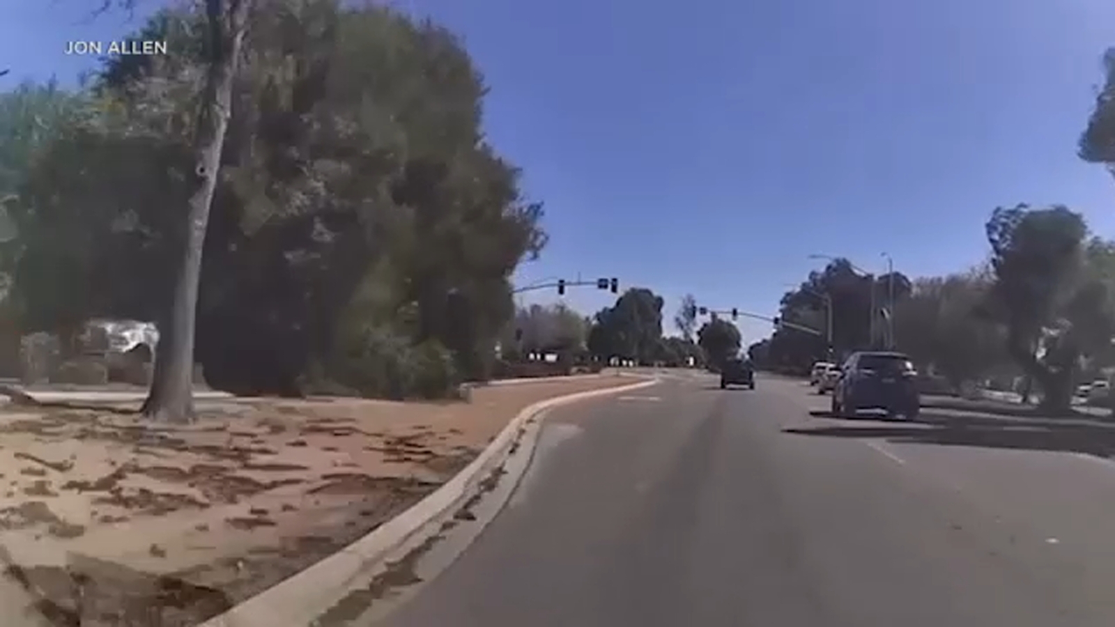 Dashcam video captured the moment a tree toppled onto a street in Ontario as fierce winds swept through Southern California Thursday.